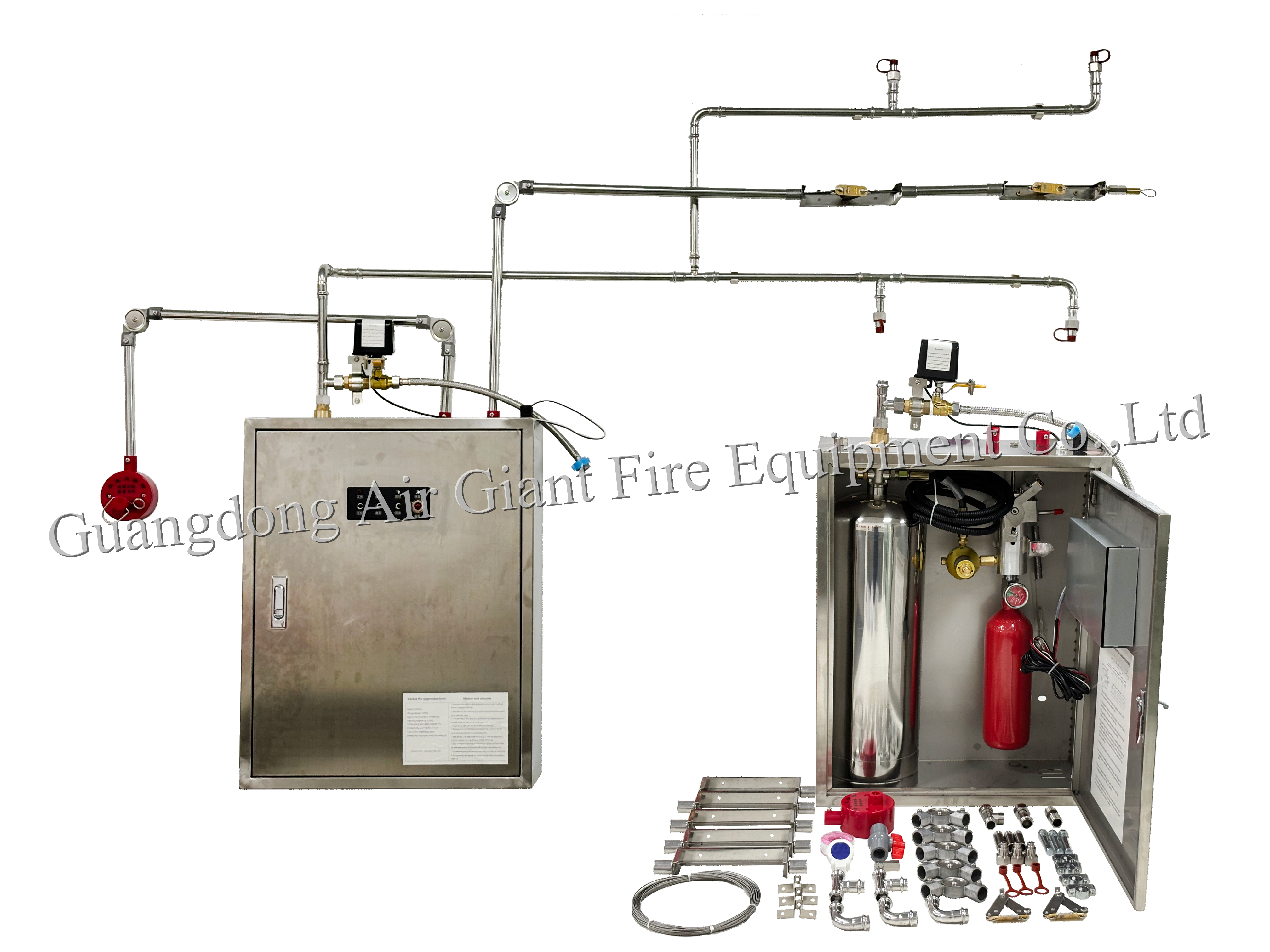 O dispositivo de extinção de incêndio para equipamentos de cozinha é um conjunto completo de dispositivos instalados em ambientes de alta umidade e calor, como cozinhas industriais, cozinhas comerciais e cozinhas civis, incluindo: